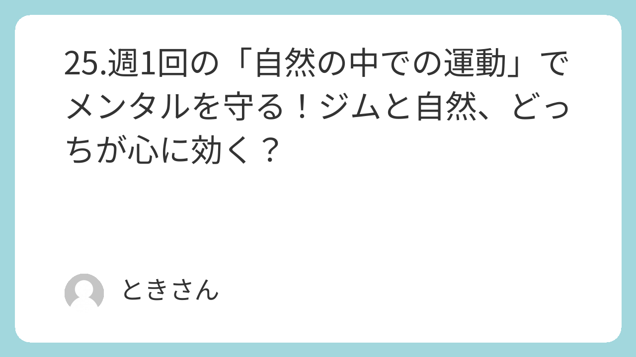運動は身体だけでなく、心のための処方箋でもあります。「どこで動くか」を少し意識するだけで、その効果を倍増させることができるかもしれません。次の休日は、心のメンテナンスも兼ねて、近くの緑道を走ってみませんか? きっと、いつもとは違うリフレッシュ感が待っているはずです。